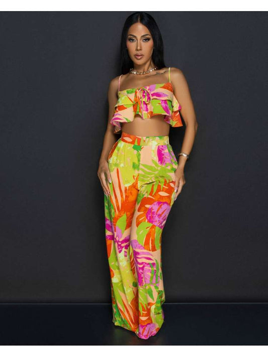 Colorblock Ruffle Edge Lace Up Tank Pant Sets